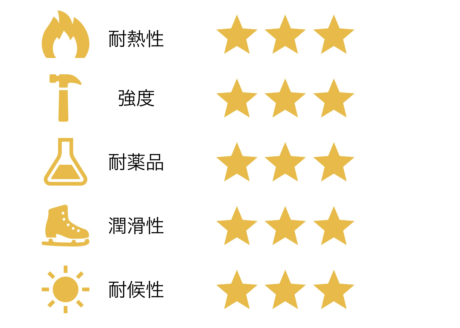 表面硬度が大きく、磨耗係数も小さく耐薬品性、自己潤滑性があり、油や有機溶剤に対して、優れた耐性があります。